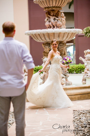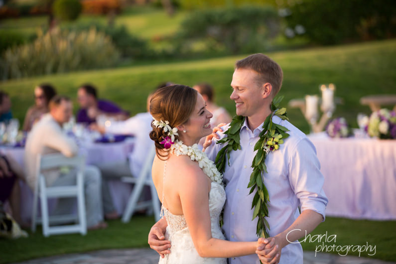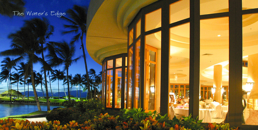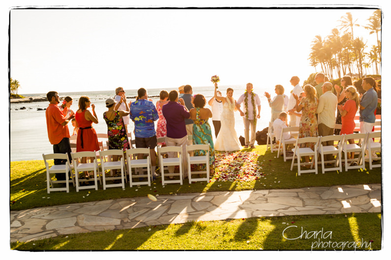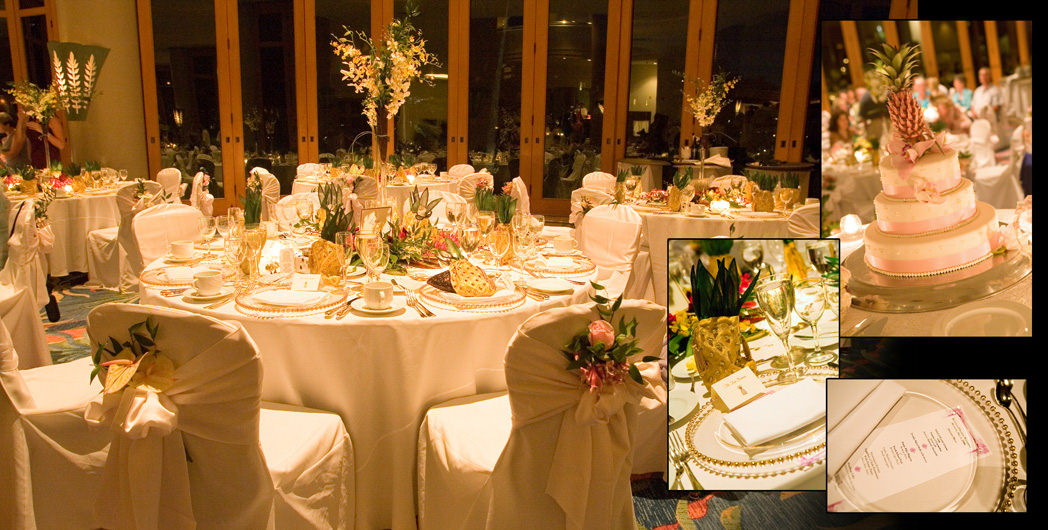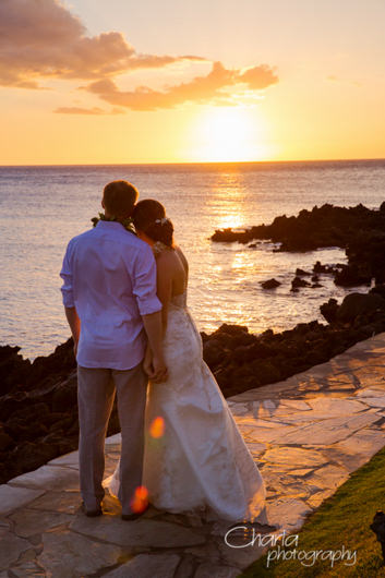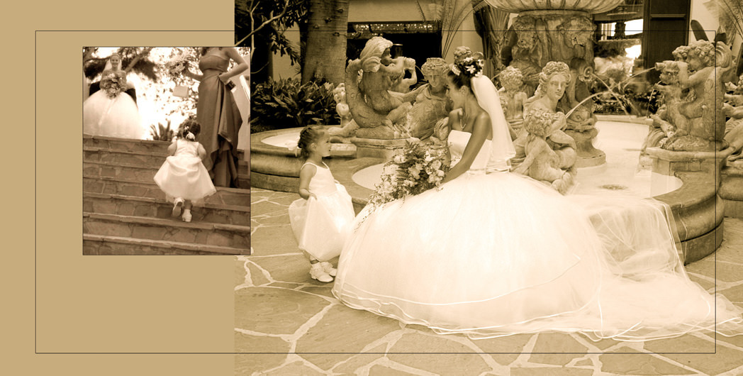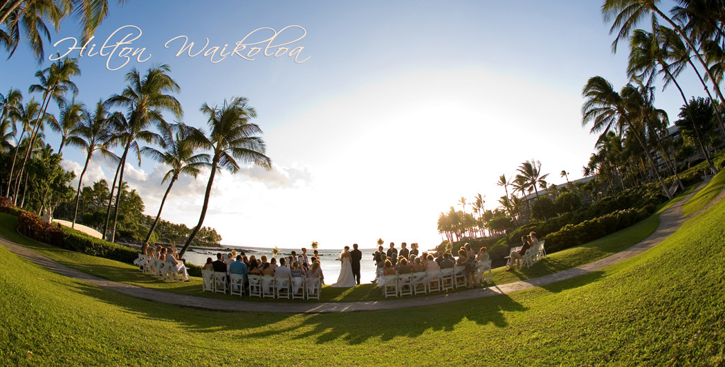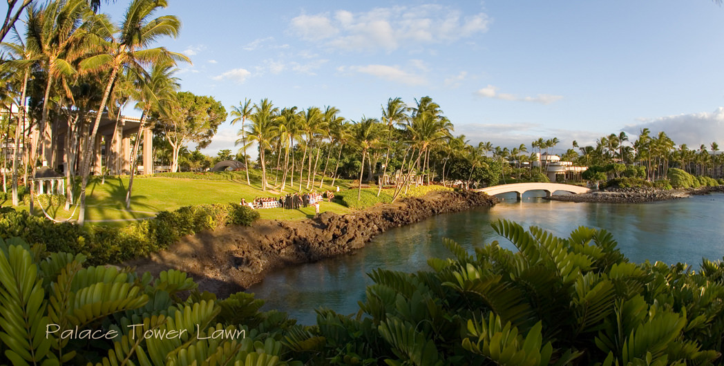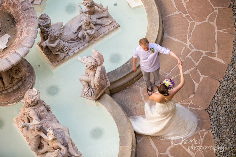 Wedding photography at the Waikoloa Village with its massive collection of Asian and Pacific and European marble and bronze sculptures and art, waterfall, and an Roman style fountain has a Big and Exotic feel. The Water's Edge is a beautiful wedding reception venue the Grand Staircase is grand, and the resident dolphins are a delight.